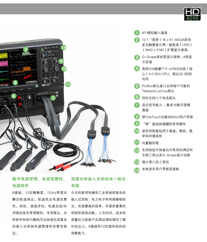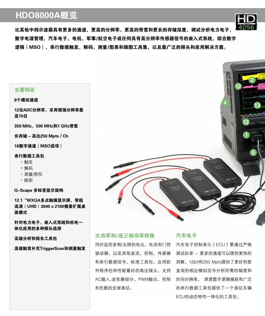 HDO8000示波器提供8個模擬輸入通道,采用力科HD4096高分辨率技術,有著高達12-bit的垂直分辨率,且?guī)捀哌_1GHz,是用于調(diào)試三相電力電子,汽車電子和機電系統(tǒng)的理想工具。